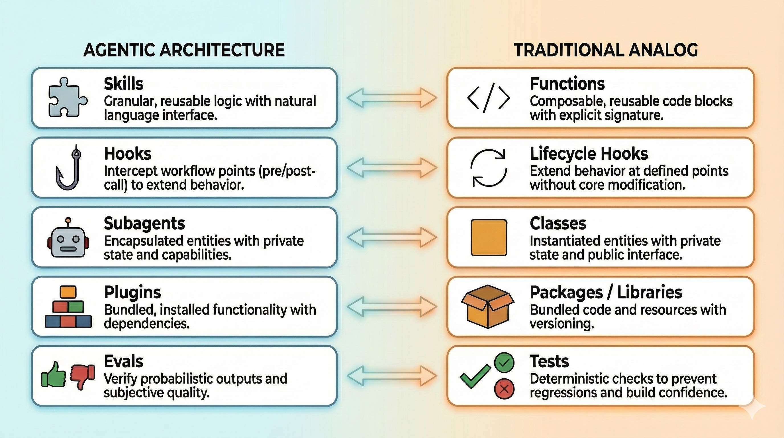 - Skills are like functions, subagents are like classes, plugins are like packages, and evals are like tests